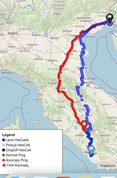 The system is designed to raise alerts only when there’s a real cause for concern. An alert only fires after multiple consecutive suspicious pings, not just one, reducing the chance of flagging ordinary events like a rest stop or a minor detour. Thresholds are calibrated to the characteristics of each lane, so the bar for what counts as „anomalous“ reflects what’s normal for that specific route.