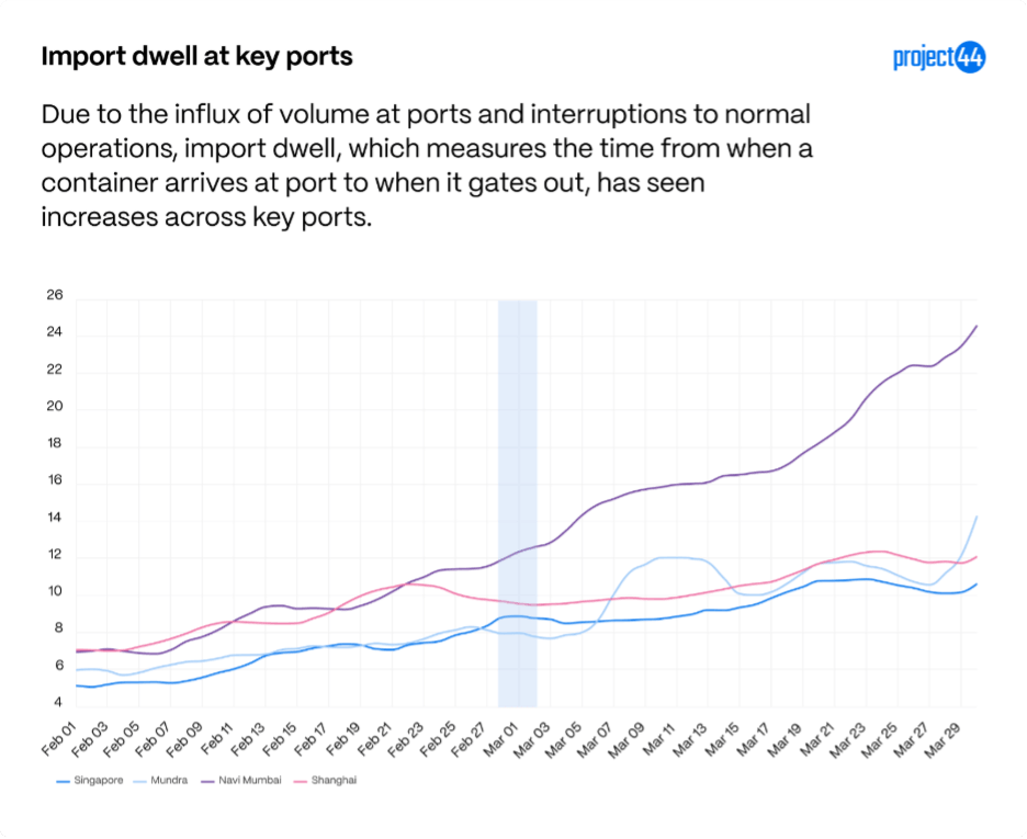 Across the four key ports monitored, Navi Mumbai, Mundra, Singapore, and Shanghai, the same structural pattern persists one month into the disruption. Import dwell is rising consistently across all four ports as rerouted cargo continues to accumulate and network adjustments remain incomplete.