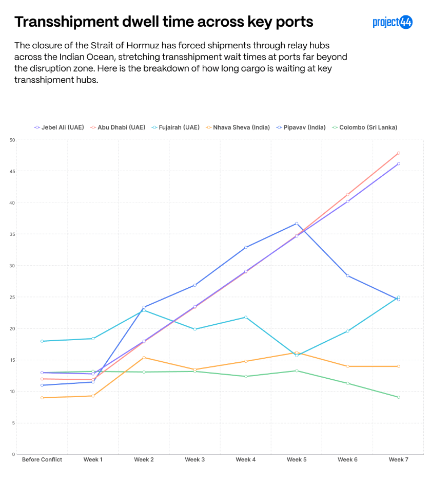 Jebel Ali has posted a new high every single week of the disruption without exception — from 13.5 days in Week 1 to 46.9 days in Week 7. That is a 3.5× increase over seven weeks with no sign of inflection. At the current rate of increase (roughly 5–7 days per week), Jebel Ali import dwell would exceed 60 days by the end of May.
