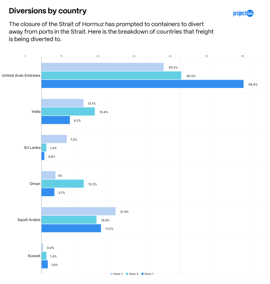 • UAE ports are saturated — 58% of diversions are staying inside the Gulf (up from 43% in Week 1), with cargo bouncing between Jebel Ali, Fujairah, and Khawr Fakkan rather than reaching end markets.