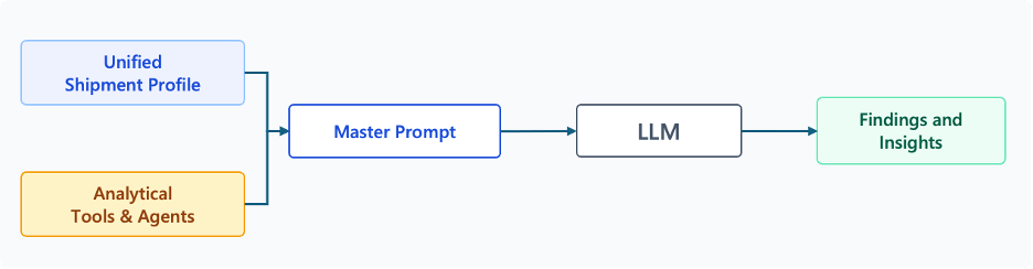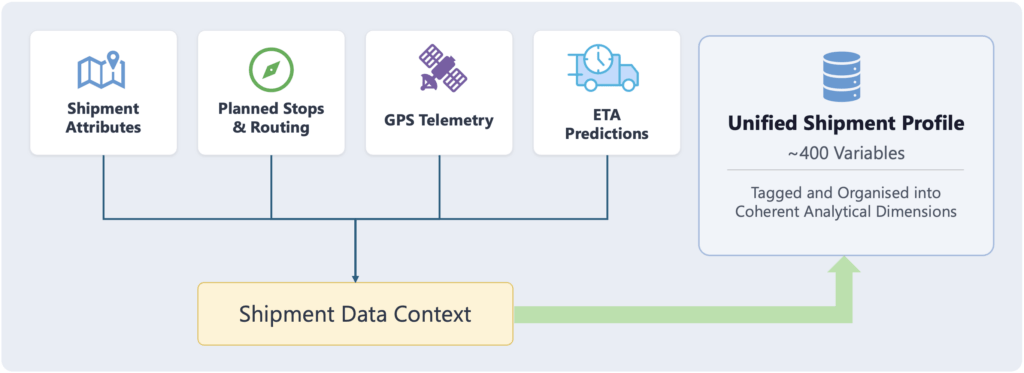 Before the system could reason ETA accuracy, it needed the same context an analyst would gather manually: shipment attributes, stop sequences, GPS telemetry, facility dwell times, and ETA prediction history. We unified these into ~400 variables per shipment, organized into coherent analytical dimensions, the foundation the agentic workflow operates on.