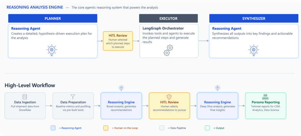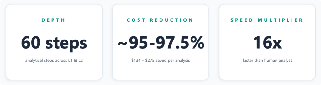 Insight depth: A typical run executes 60 analytical steps across both L1 and L2, covering segmentation, trend analysis, anomaly detection, and entity-level drilldowns. In validation testing, the system surfaced new driving factors that the original manual analysis had not identified, while matching all existing findings with zero misses.