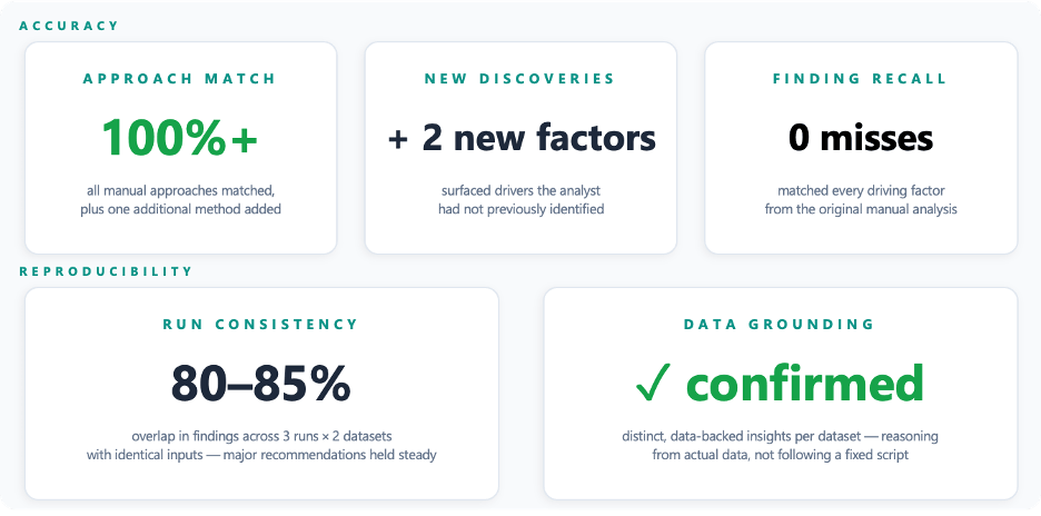 The workflow identified every driving factor from the original analysis – 100% overlap with manual analysis plus new ones the analyst had not found. Most analytical approaches matched; the workflow introduced one additional approach. The only gap was in reporting granularity: segment-level breakdowns were computed but not fully surfaced in the automated report, a templating issue, not an analytical one.