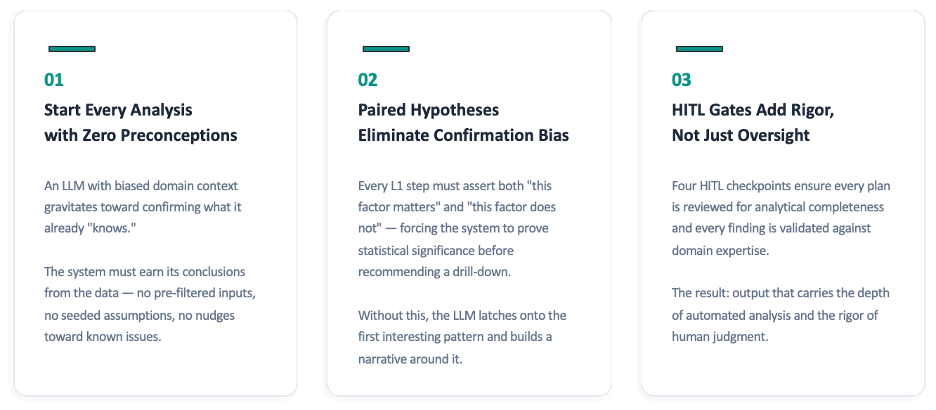 Level 2 – Evidence-based drilldowns: Only the top-ranked findings from Level 1 move forward. This is the only stage where data filtering is allowed, ensuring the system doesn’t narrow its view prematurely.