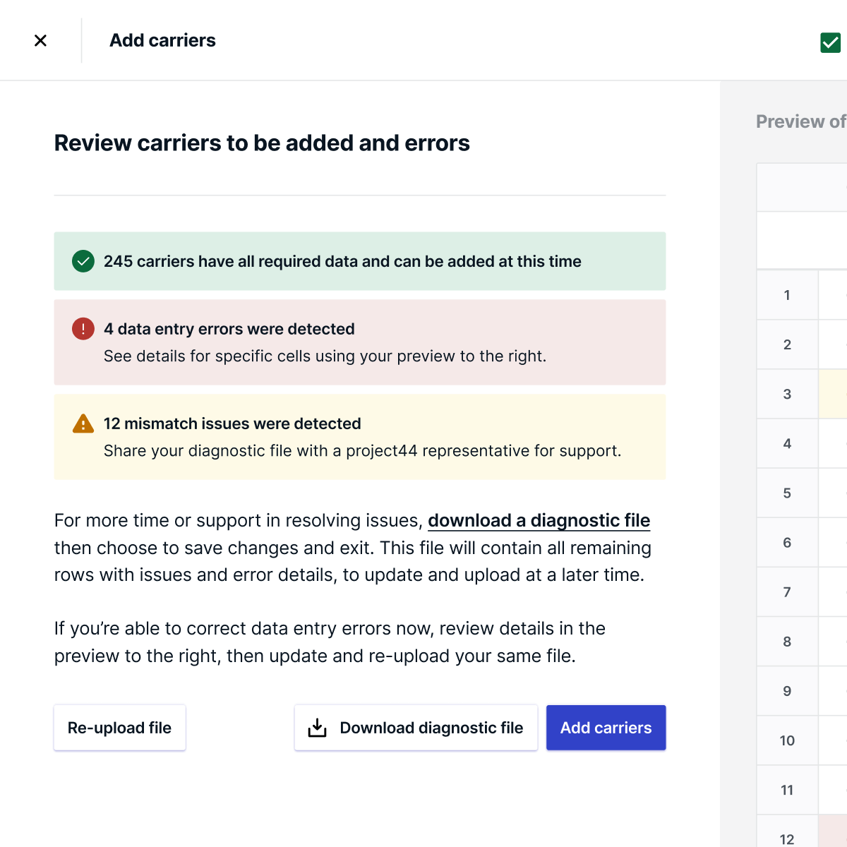 キャリアリストをConnection Centerにアップロードします。 陸上輸送(FTL、LTL)、海上輸送、航空輸送、小包輸送など、すべての輸送モードを一つのワークフローでまとめてキャリア追加できます。 テンプレートをダウンロードし、キャリア名、輸送モード、識別子(SCAC、DOT、VAT)などの詳細情報を入力して、数秒でアップロードが完了します。
