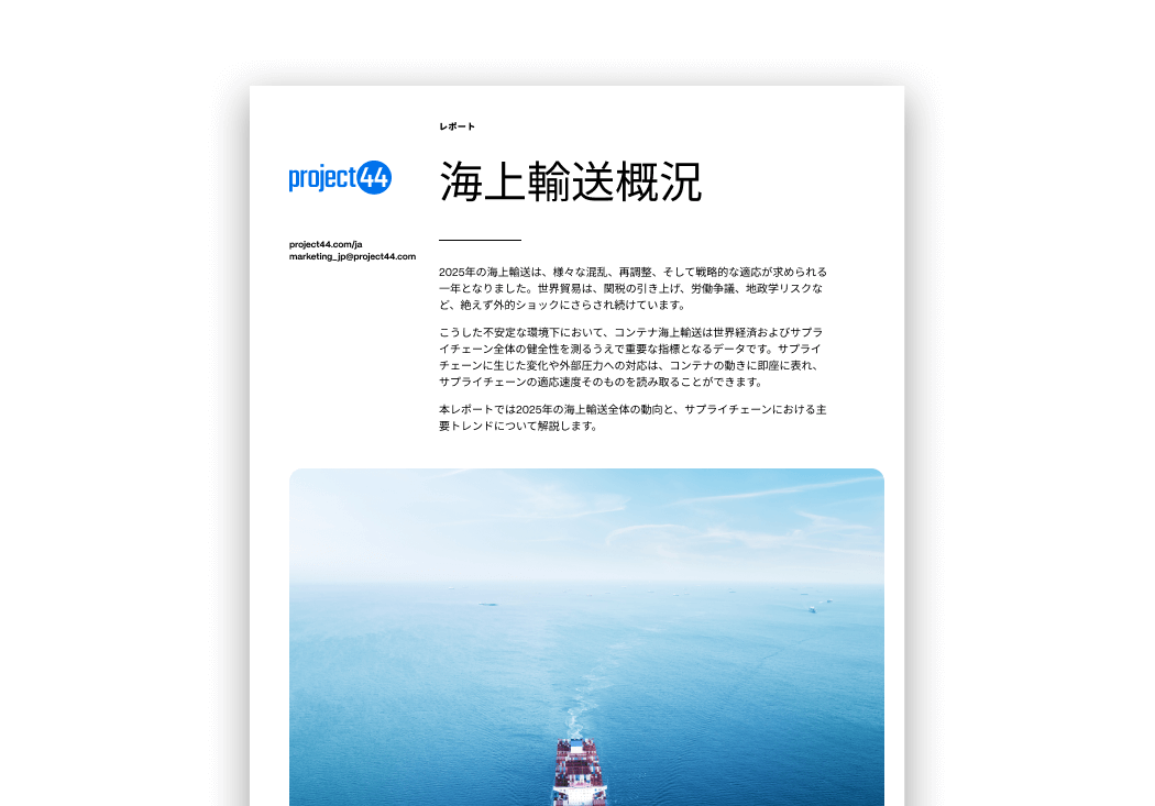 2025年は、関税の引き上げ、ソーシング戦略の転換、地政学的な不安定化、需要の低迷を受けてキャパシティ調整や航路変更が相次ぎ、世界の海上輸送の構造変化が進んだ年になりました。project44のデータを基に、2025年の海上輸送全体の動向とサプライチェーンにおける主要トレンドに関する分析をレポートにまとめました。<詳細を読む>