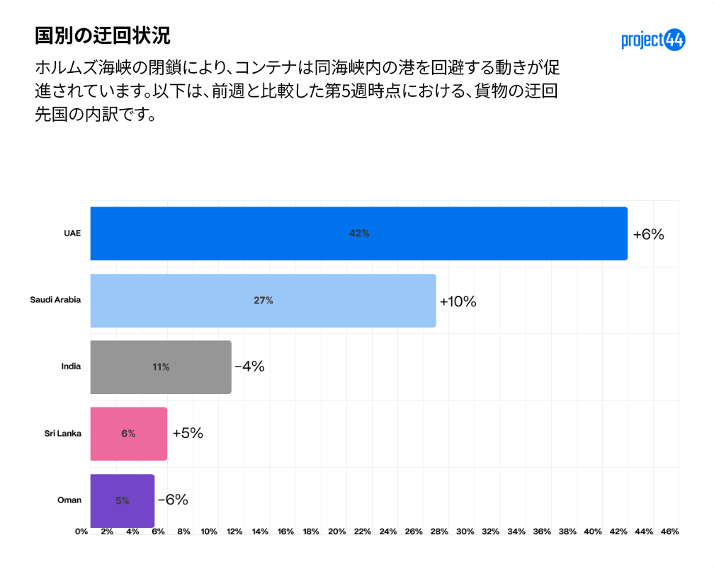 UAEは引き続き迂回の最大受け入れ先で、先週は迂回貨物の42%を占めました。ただし、最近のホール・ファッカンでの攻撃により、この状況は変わる可能性があります。サウジアラビアは5週間で全迂回の4%から24%へ急増し、現在は第2位の貨物迂回先となっています。