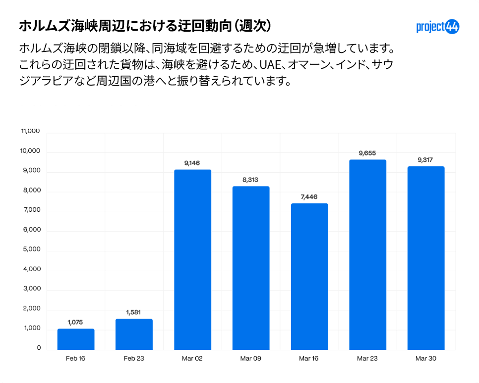海峡が閉鎖される前、週間のルート変更数は通常の運用範囲内とされる2,000件未満でした。しかし、3月2日の週にはその数字が9,146件に急増し、その後も減少していません。 実際、ルート変更の数は増加し続けており、3月23日の週にはピークとなる9,655本のコンテナーがルート変更され、3月30日の週も9,317件とそれに次ぐ高い数値を記録しました。
