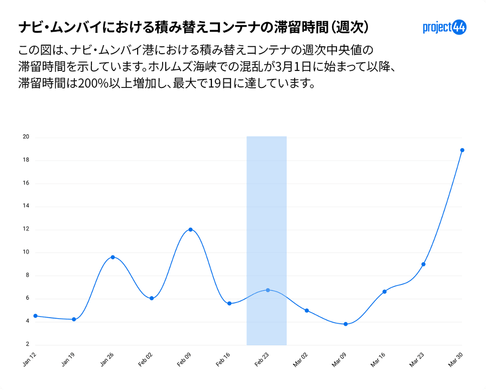 - ナビ・ムンバイは現在、海上輸送ネットワークにおける最大負荷となっているボトルネックです。トランシップメント(積み替え)量は紛争前比で1,300%超増加し、輸入滞留はほぼ倍増しています。