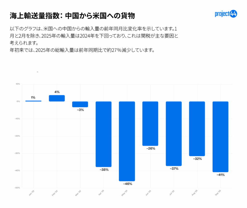 輸入の観点からは、中国から米国への輸送量は、2024年と比較して今年度の時点で27%減少する傾向にあります。 1月(+1%)と2月(+4%)に小幅な増加を記録した後、輸送量は急激に減少し、4月は-38%、5月は-46%、9月は-41%とそれぞれ減少しました。 これらの変動は、関税や前倒し輸送の動きが年初頭に急増し、その後夏期および秋季にかけて持続的な低迷を招いたことを示しています。