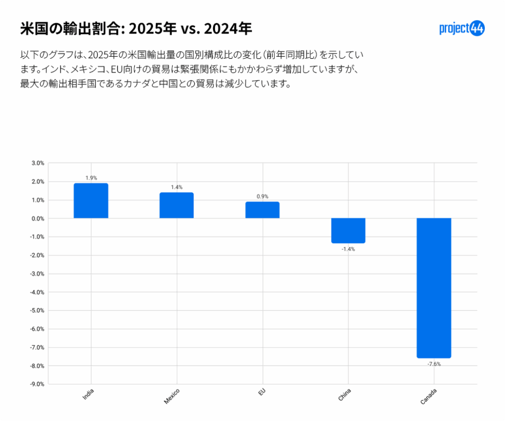 関税措置により特定の貿易ルートが再形成された一方で、2025年の米国の輸出入比率は国別に見ると、わずかな変化にとどまっています。 これは、政治的および経済的な逆風があるにもかかわらず、ほとんどの米国企業がソーシングや顧客基盤を大幅に再構築していないことを示しています。