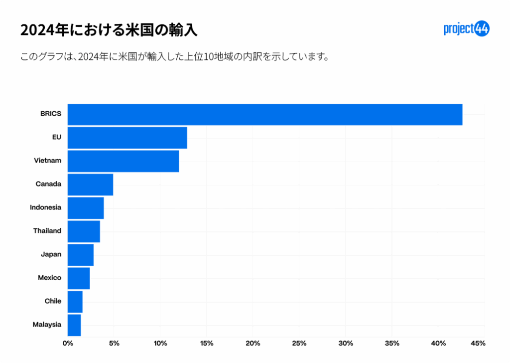 BRICSカテゴリの一員である中国が最大の輸入相手国であり、次いでEUおよびベトナムが続きます。 これら3つの地域は、project44が2024年に追跡した輸入全体の50%以上を占めています。