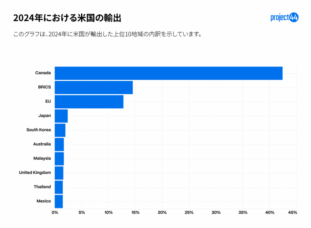 project44のデータに基づいて、米国製品を最も多く輸入している国を以下に示します(アメリカからの輸出先)。
