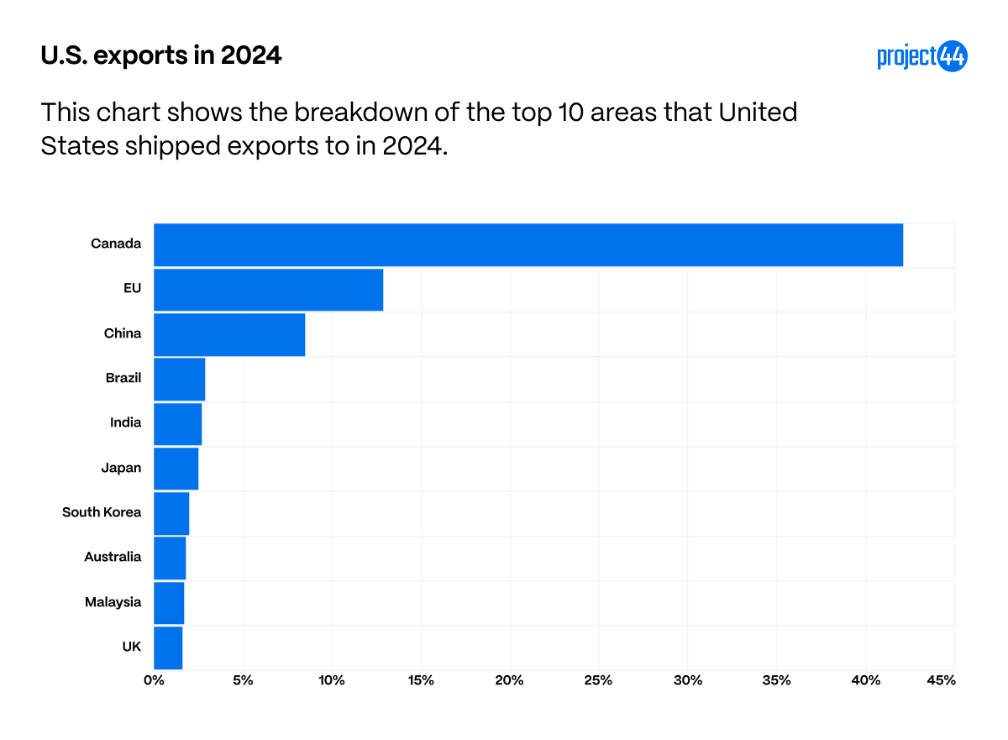 project44のデータに基づいて、米国製品を最も多く輸入している国を以下に示します(アメリカからの輸出先)。