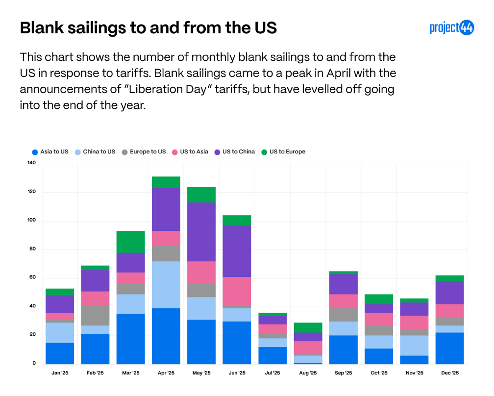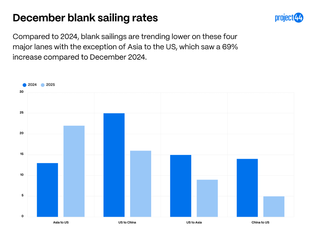 アジアから米国向けは例外であり、2024年と比較して69%増加し、2024年12月より9件多い抜港となりました。この要因の一つとして、メキシコが2026年1月から多数のアジア諸国に対して発表した最近の関税が挙げられる可能性があり、これによりこれらの航路から需要が引き続き流出することが見込まれます。