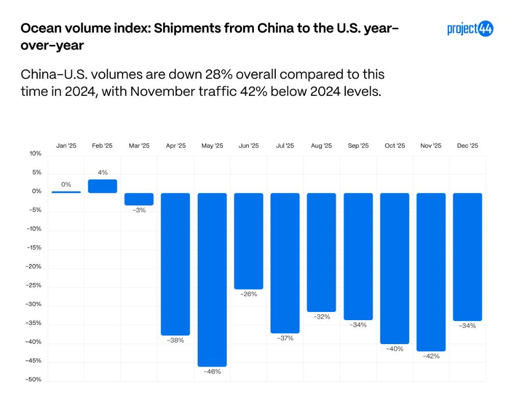 全体として、本データは、2025年が関税措置および前倒し需要に起因する高いボラティリティを伴って始まった一方で、年末に向けて状況が安定化し始めていることを示しています。抜港は、不確実性への対応としてキャリアがキャパシティを調整した結果、4月にピークを迎えましたが、12月までには配船スケジュールは概ね正常化し、月次変動が一部見られるものの、需給がより均衡した状態へ回帰していることを示唆しています。同時に、関税は引き続き貿易の流れを大きく変えており、年末の通商協議が輸出のわずかな改善を支えたように見えるものの、米国の対中輸入と対中輸出はともに前年比で大幅な減少傾向にあります。中国からの取扱量が減少する中、代替調達戦略はより確立されつつあり、インドネシアやタイといった東南アジア諸国が代替需要の一部を吸収しています。