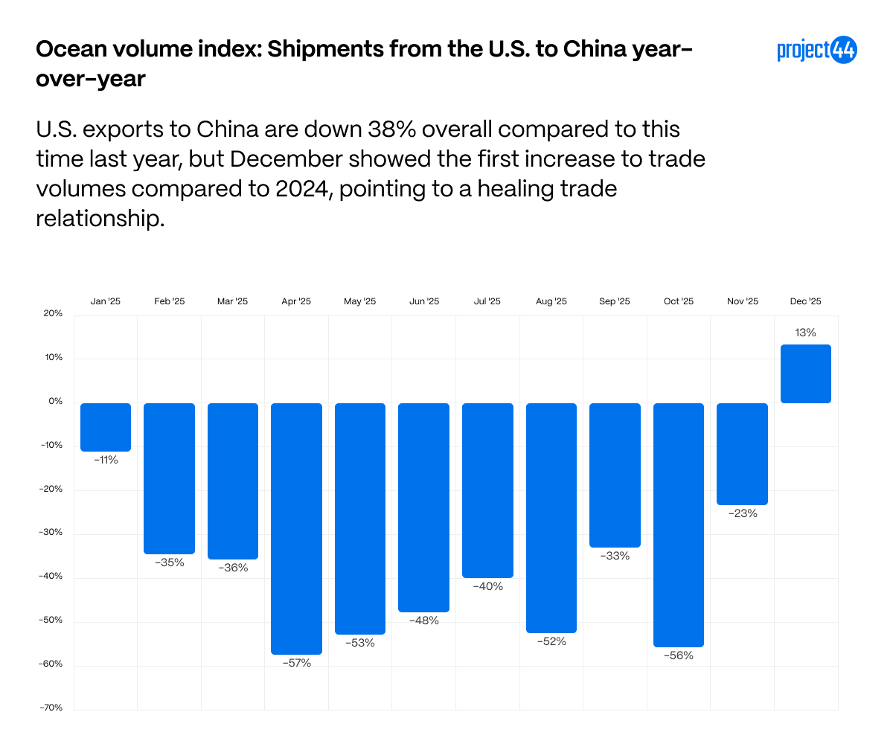 輸出面では、米国から中国への出荷はさらに大きな圧力にさらされており、年初来で38%減の傾向にあります。米国の対中輸出が低迷した1年でしたが、11月の減少幅は2024年比で1月以来最小の23%減にとどまり、12月は2025年比で13%増加し、2025年の対中輸出で初めてのプラス成長を記録しました。トランプ大統領と習近平国家主席は10月末に暫定的な貿易合意について会談を行い、これが米国の対中輸出を刺激したとみられますが、この協議による中国から米国への輸入における顕著な変化は、現時点では確認されていません。