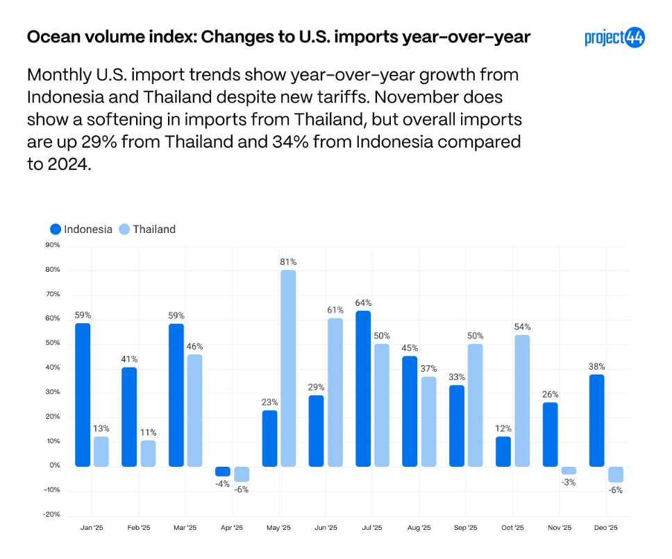 通年では全体的に成長しているものの、「解放の日」と呼ばれた相互関税の発表を受けて、4月は両国からの輸入が減少しました。また、11月および12月も、2024年と比較してタイからの輸入は減少を示しています。戦略的調達の観点からはインドネシアが「勝者」として浮上しているように見えますが、タイはホリデーシーズンに人気の高い多くの消費財の供給源であるため、直近2カ月の動きは、企業が戦略的に他国へ調達先を切り替えたというよりは、主要な輸入品に対する消費者需要の軟化を反映している可能性があります。