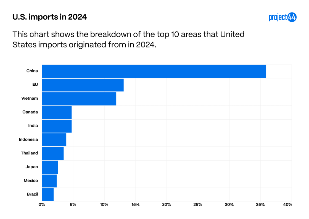 中国(BRICSカテゴリーに含まれる)は、米国にとって最大の輸入供給国であり、次いでEU(欧州連合)とベトナムが続きます。 これら3つの地域は、project44が2024年に追跡した輸入全体の50%以上を占めています。