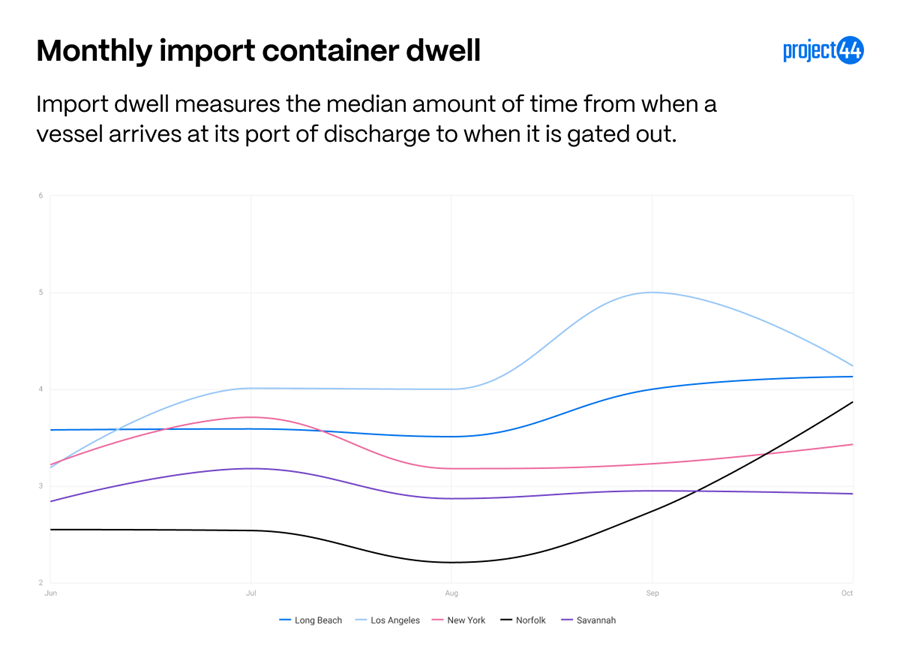 Throughout the strike and hurricane season, median import dwell times at East Coast ports have remained steady, with the exception of Norfolk, which saw an increase of nearly two days from August to October.