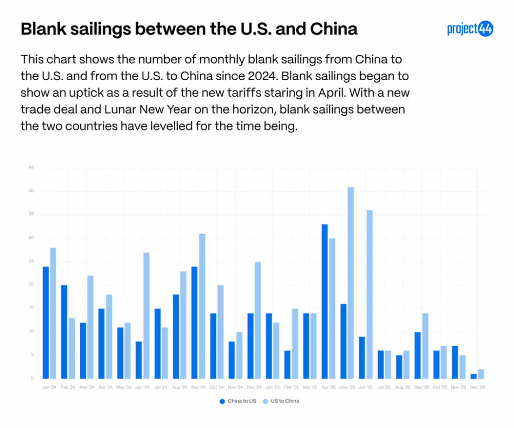 中美之间的空班航运仍是全球贸易的一个关注点。 2024 年 1 月至 2025 年底,美中航线的空班航运从相对稳定的模式转变为剧烈波动。