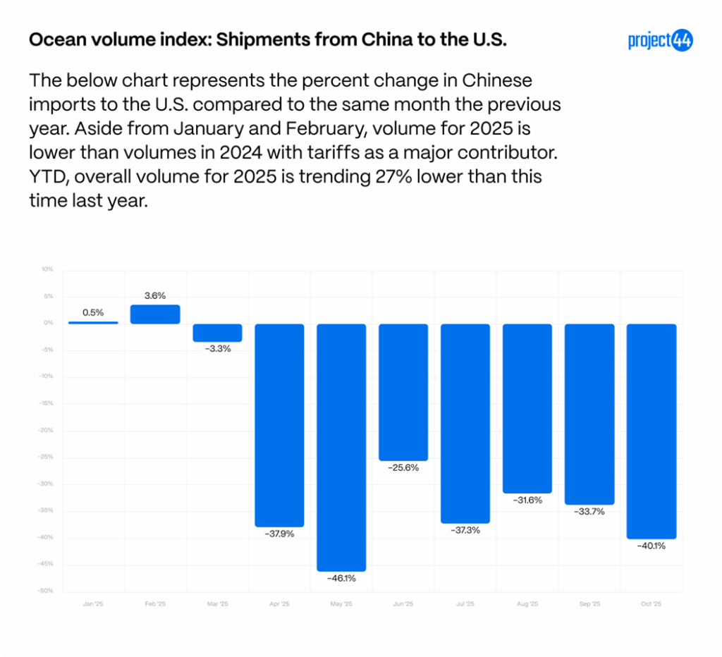 在进口方面,今年迄今为止,从中国到美国的货运量比 2024 年同期下降 27%。 在 1 月(+1%)和 2 月(+4%)小幅增长后,货运量大幅下降,截至 10 月,与 2024 年同期相比,一直维持在低 40% 的水平。 这些波动说明了关税和提前备货行为是如何导致年初的增长,然后在夏季和秋季持续疲软的。