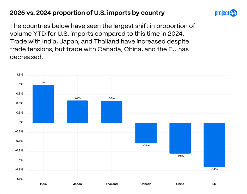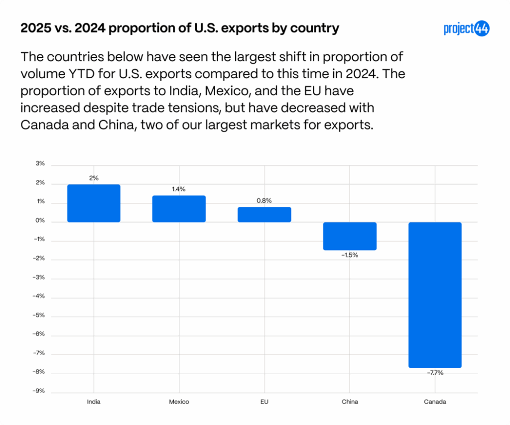 2025 年的关税环境导致美国贸易出现重大波动,空班航次大幅攀升,中美之间的贸易额创下历史新低。 从中国的进口量今年迄今下降 27%,出口量下降 42%。 运力削减主要集中在关键航线,其中从美国东海岸至南亚的空班航次增加 186%,从美国西海岸至欧洲的空班航次增加 60%。 与此同时,从泰国和印度尼西亚的进口量激增逾 30%,而对印度和墨西哥的出口则实现了温和增长,这反应了企业正使其贸易伙伴多元化。 小额豁免的终止给承运商和消费者增加了新的处理负担,但最后一公里的履约表现在 10 月保持稳定。 总体而言,关税、运力削减和贸易关系变化正在重塑全球航运模式,并促使美国采购战略逐渐发生变化。