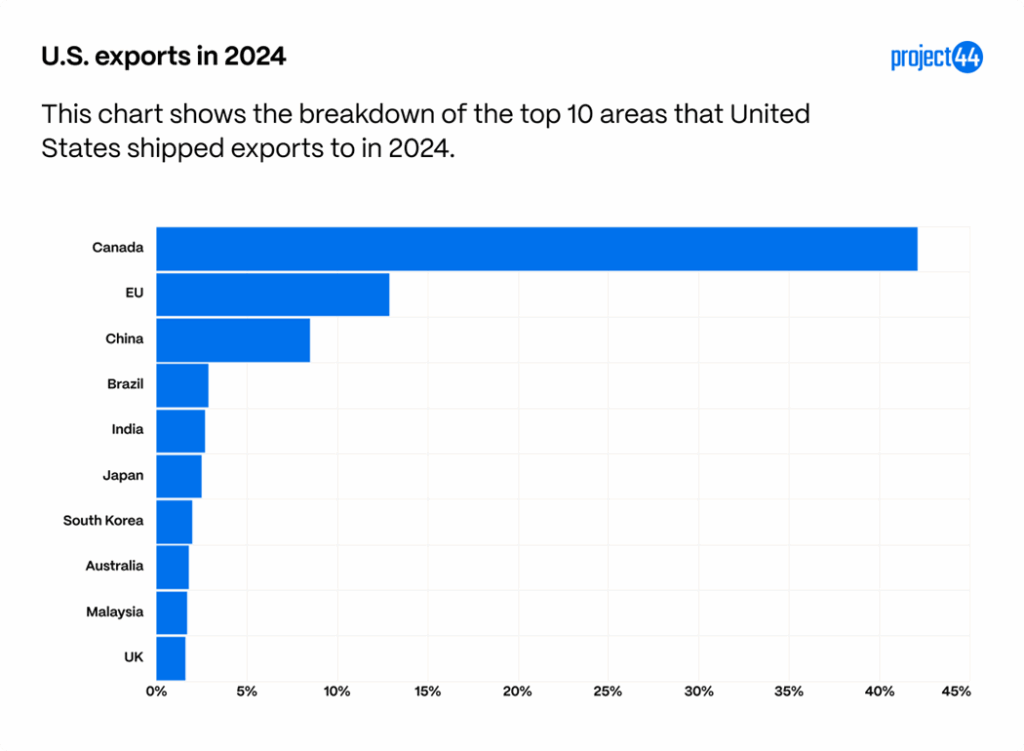作为金砖国家 (BRICS) 成员的中国是我们最大的进口国,其次是欧盟和越南。 根据 2024 年 project44 的追踪数据,这三个地区的进口量占美国总进口量的 50% 以上。